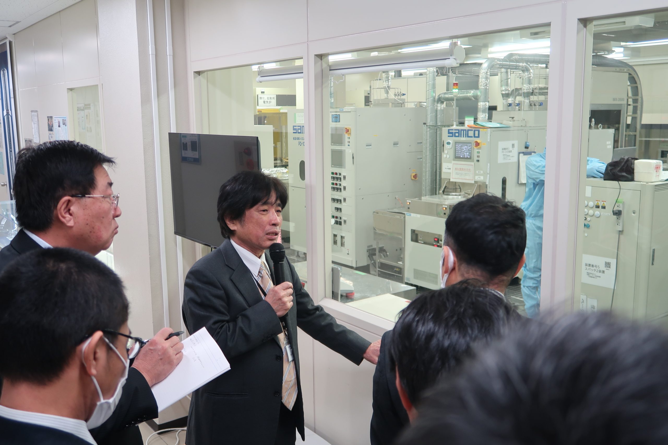 センター運営状況の説明とクリーンルームを含む施設や設備の見学、意見交換等を行いました。